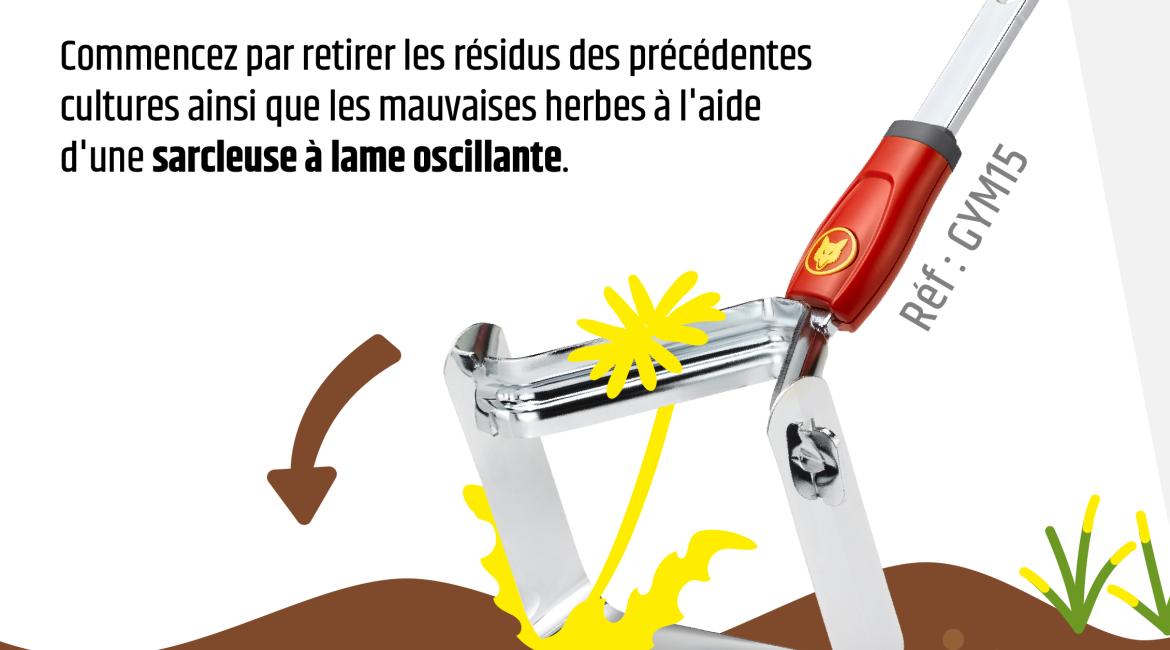 Commencez par éliminer les résidus de cultures et les mauvaises herbes. Pour cela, rien de mieux qu’une sarcleuse à lames oscillantes (MULTI-STAR - GYM15) ou une serfouette (MULTI-STAR - LNM).